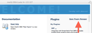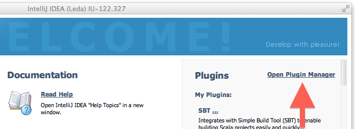 Once SBT, Scala, and IntelliJ are installed, we’ll get started configuring the IntelliJ Scala and SBT plugins. The EAP version is currently called LEDA UI, not IntelliJ as you might expect. Start LEDA IU, then click “Open Plugin Manager”.