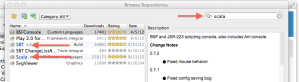 Once the plugin manager loads, we’ll click “Browse Repositories”, then search for Scala. In the results, click the check mark to install both SBT and Scala. These plugins don’t work in IntelliJ 11, it’s important that you use the latest EAP. The plugins will download and install. Close “LEDA IU” once they’re done installing. We’ll use SBT to create our project.